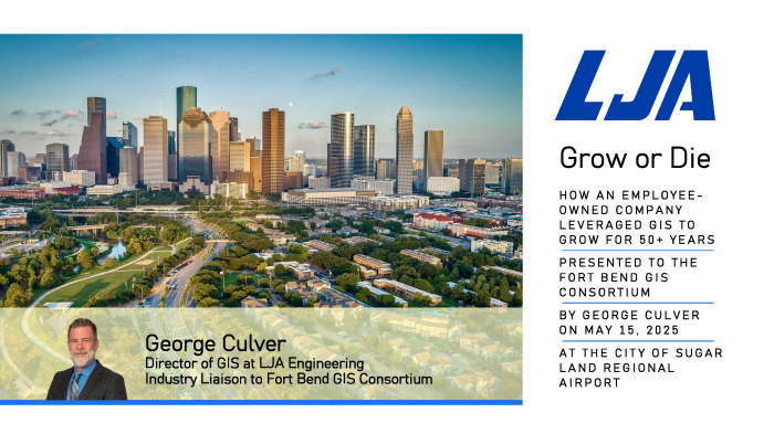 City of Sugar Land Regional Airport, May 15, 2025 – Mr. George Culver, Director of GIS at LJA Engineering (LJA) and the Industry Liaison to the Fort Bend GIS Consortium (FBGISC) presented to members and greater area partners on the leverage of GIS by LJA as the employee-owned company grew from 40 to over 2,000 employees over LJA’s 50+ years of business. Emphasizing LJA’s unofficial motto of Grow or Die, Mr. Culver guided attendees through the adoption and growth of GIS across every department and operation within LJA. Beginning with the all too familiar task of layering parcels over imagery, to the use of automated data processes, to the integration of company-wide communications into project packets complete with land history, parcel data, land development prospects, and existing trails of correspondence, LJA has not only leveraged existing GIS solutions available on the market, but pushed past the boundaries of what is available and supported the development of their own internal geospatial solutions and infrastructure.