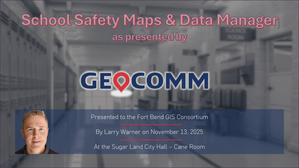 Sugar Land City Hall – Cane Room, November 13, 2025 – The Fort Bend GIS Consortium (FBGISC) welcomed GeoComm as the featured presenter for the 2025 4th Quarter meeting. Represented by Mr. Larry Warner and supporting colleagues, GeoComm introduced members to their School Safety Mapping Solution, a modern, GIS-driven approach to improving situational awareness for public safety and school district partners.